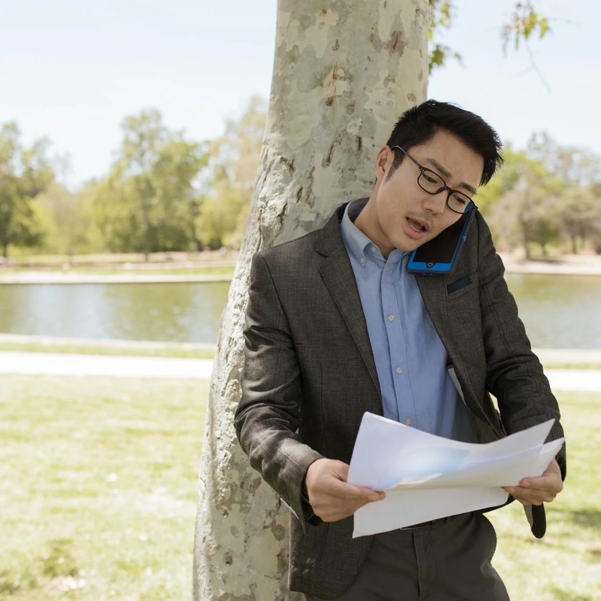 契約書の内容を確認しながら電話対応している様子